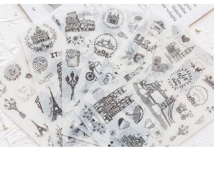 モノクロステッカー 手書き風ステッカー 旅行イラストステッカー 手帳ノート